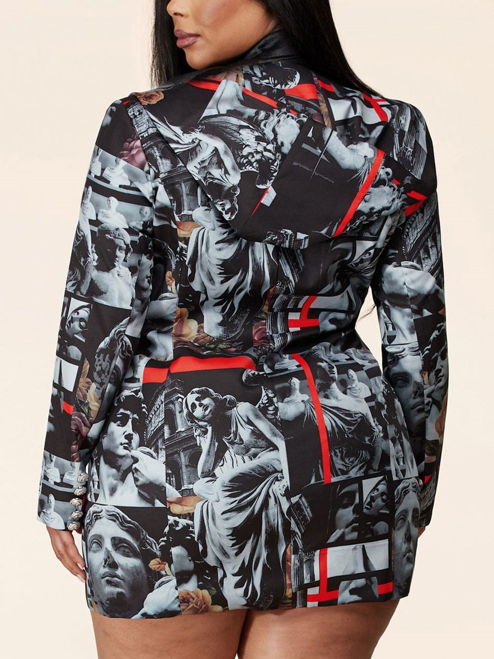 Midnight in Romeβ€οΈ~Plus Size Artistic Print Blazer Dress β Long Sleeve Button Front Bodycon Mini Dress with Graphic Design