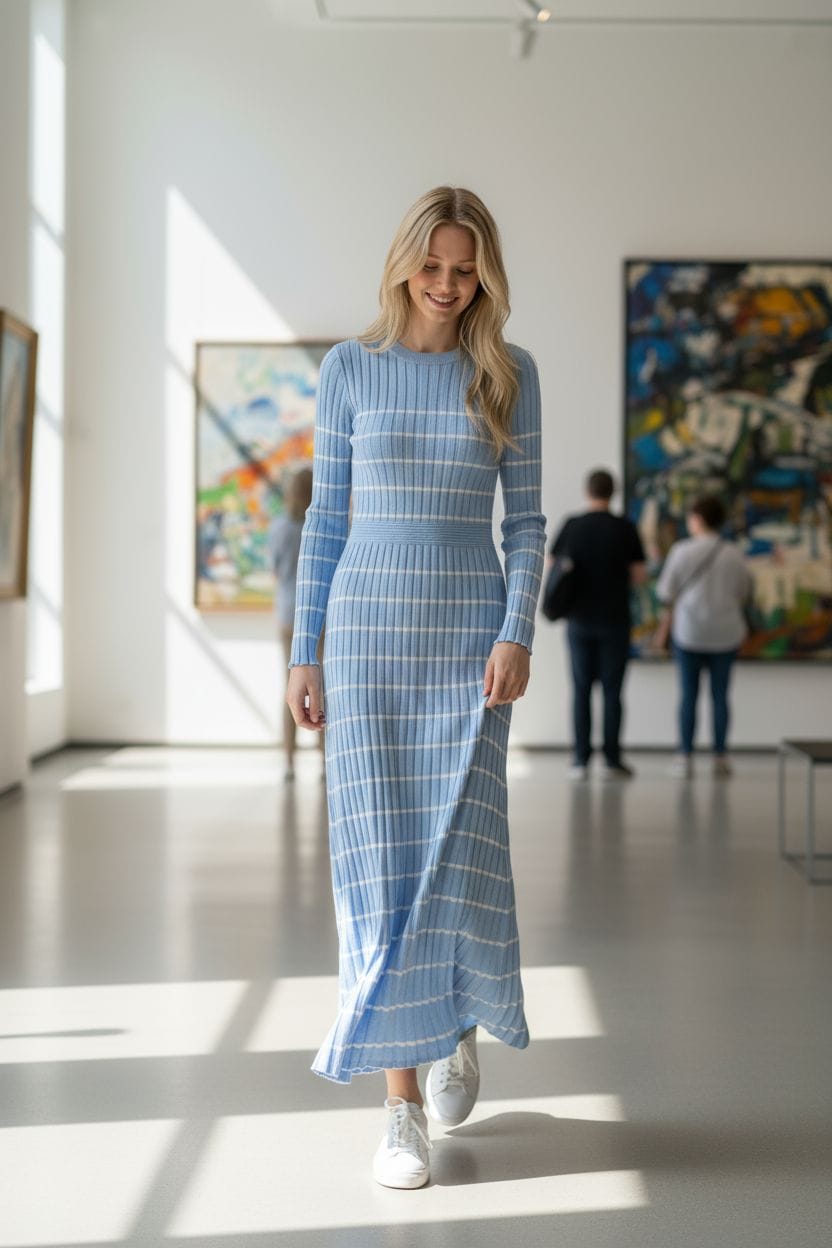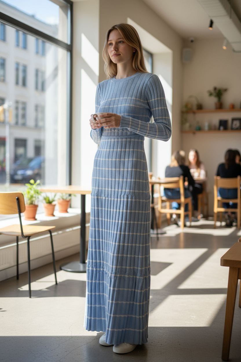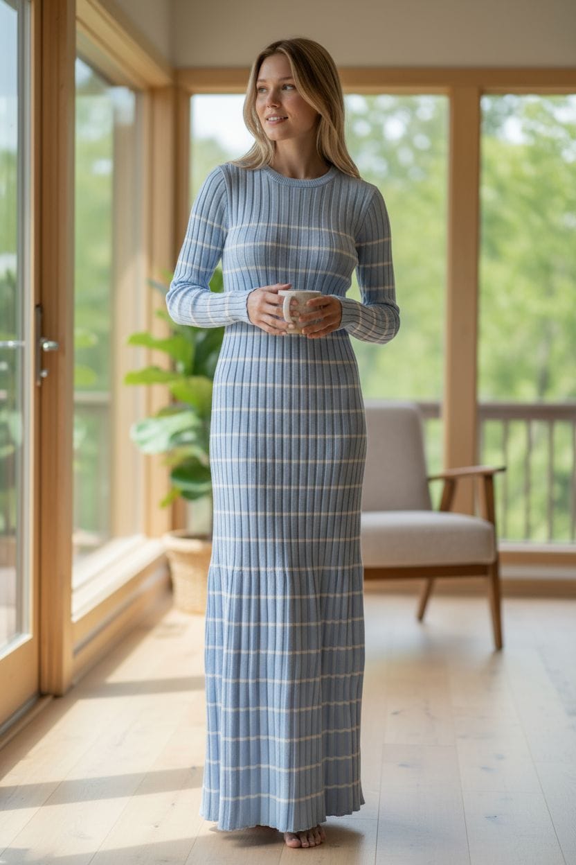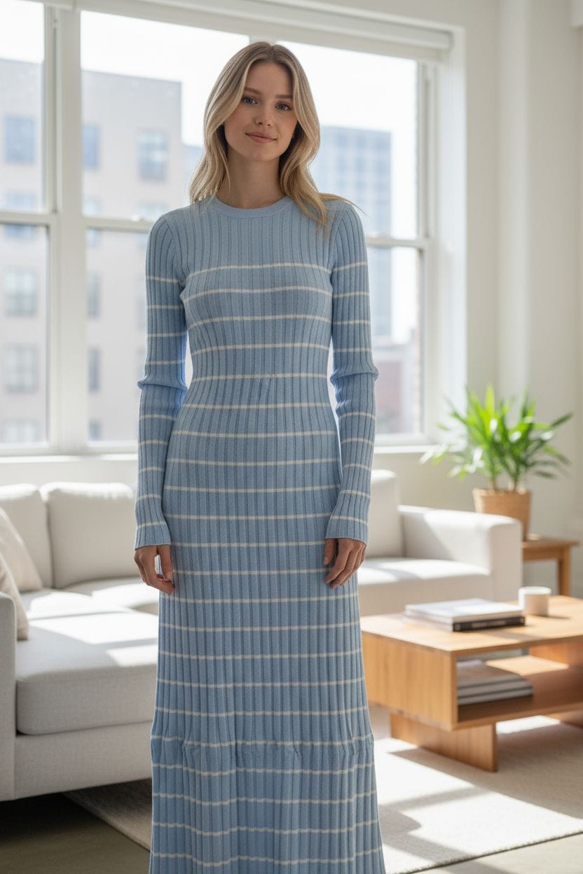 Stay effortlessly chic and cozy in our Blue Bliss Striped Sweater Maxi Dress 💙☁️. Designed with dreamy sky-blue and white stripes, this long-sleeve ribbed knit dress wraps you in warmth and softness while keeping your look polished and graceful ✨.