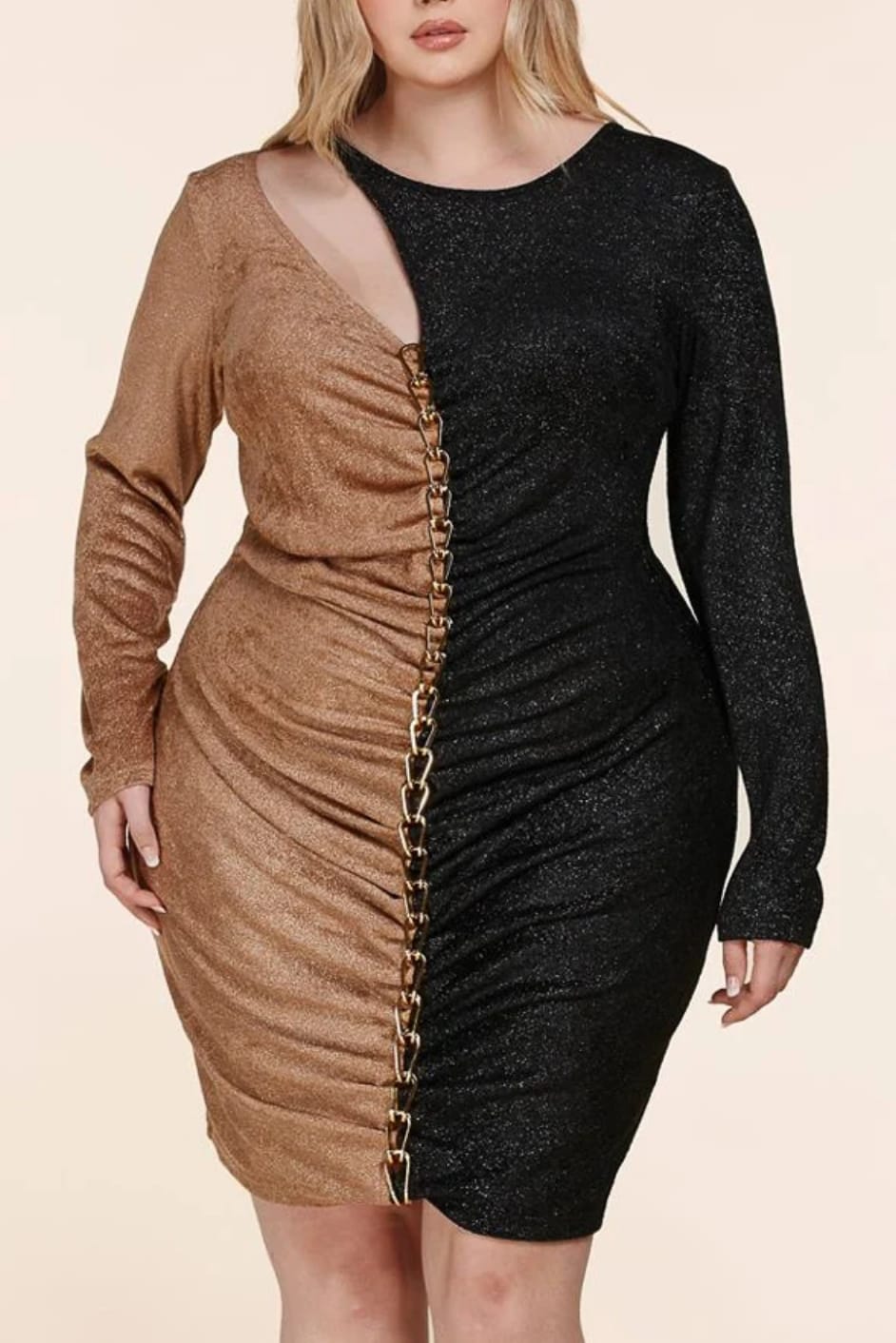 Linked by Love🖤~Plus Size Colorblock Bodycon Mini Dress – Long Sleeve Glitter Dress with Gold Heart Chain Detail