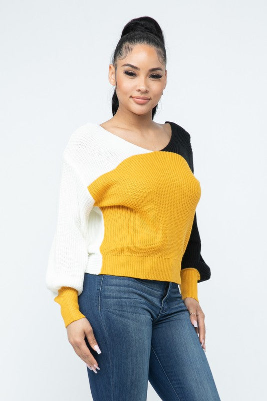This color block pullover blends mustard, black, and white panels for bold, wearable contrast.