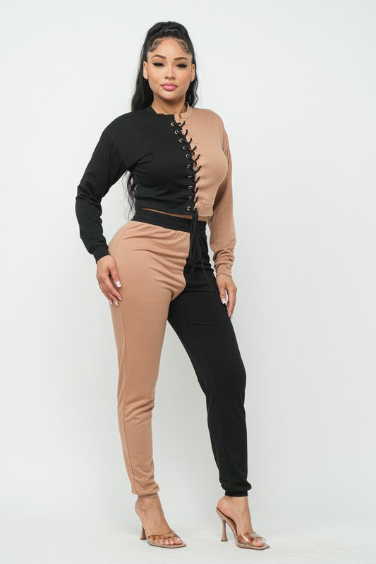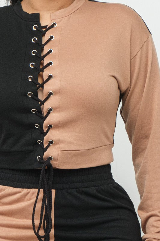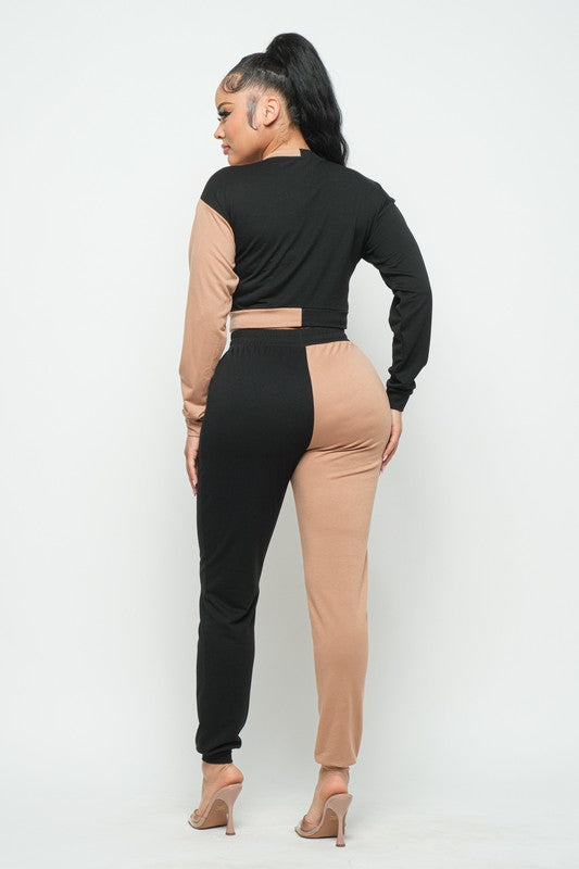 Sleek two-tone color block jumpsuit sculpts a slim silhouette with a high waist and long sleeves for confident evening style.