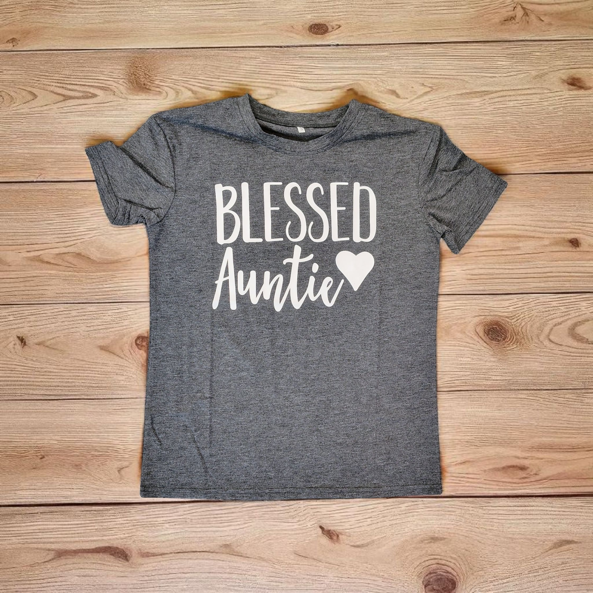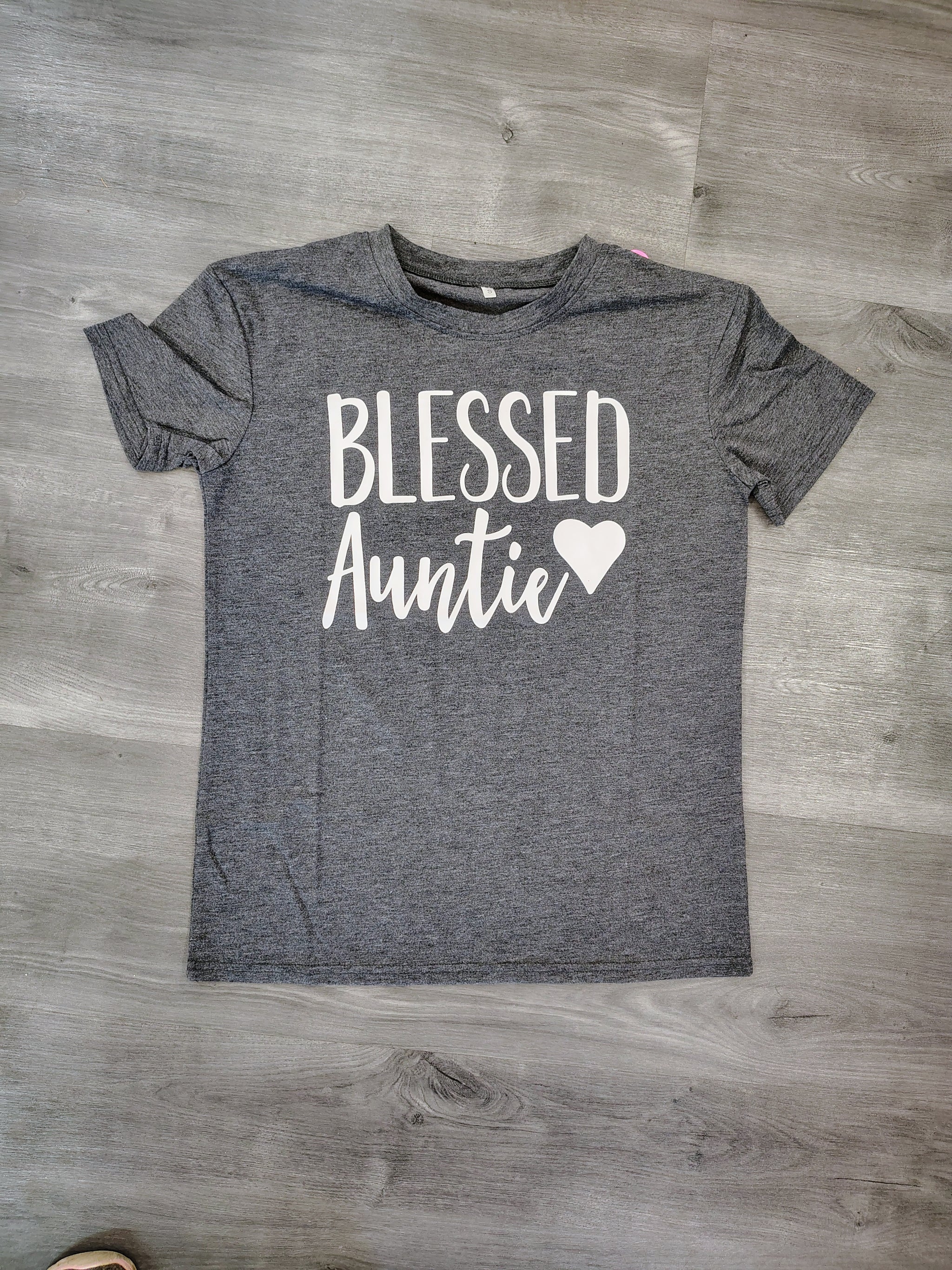 Heather gray with white “Blessed Auntie” print and heart design