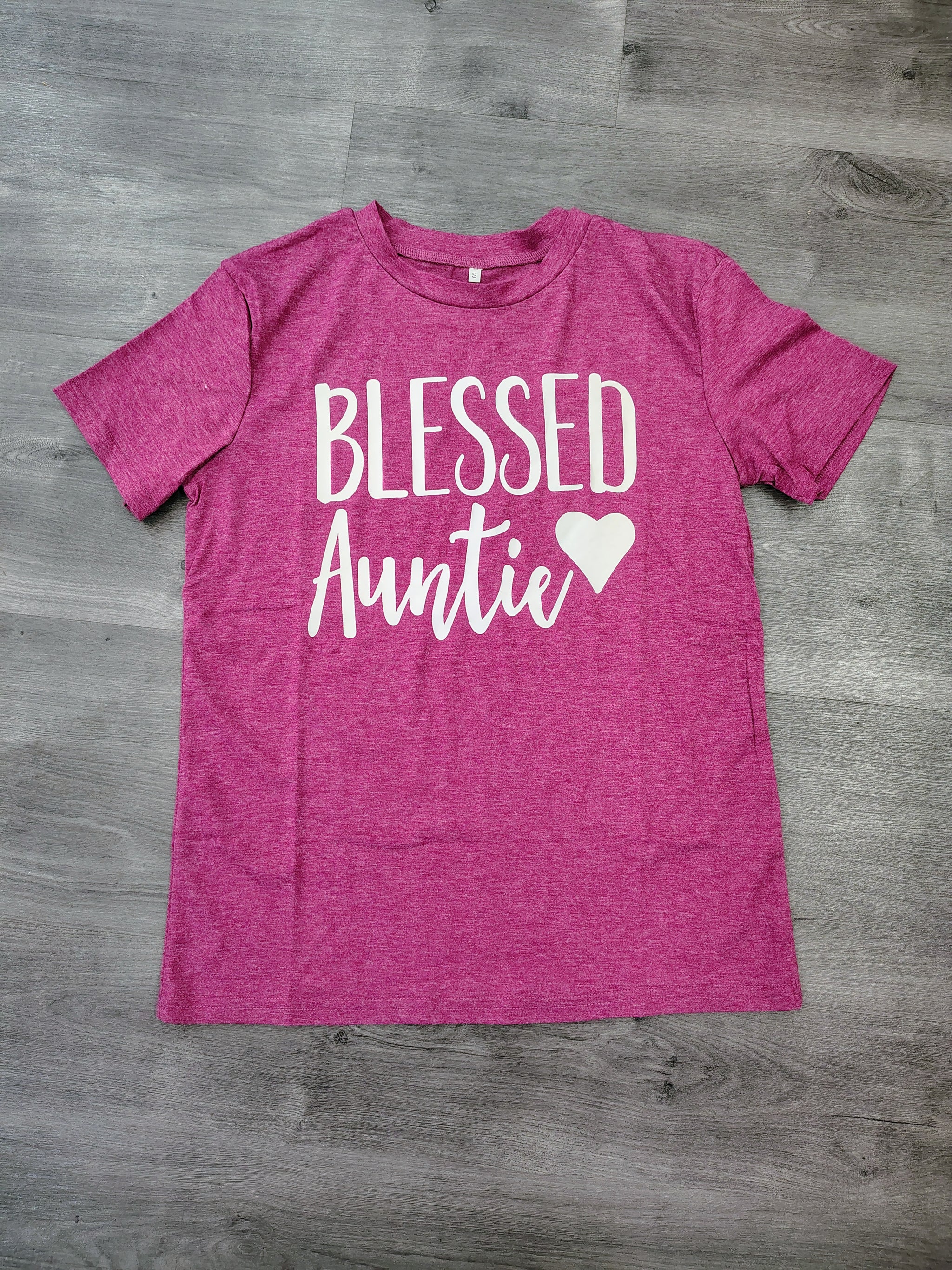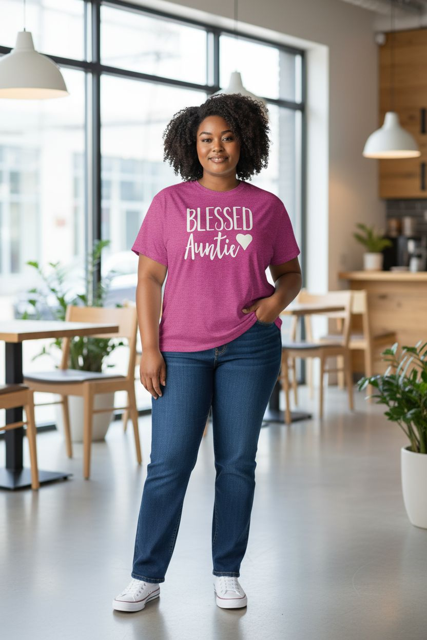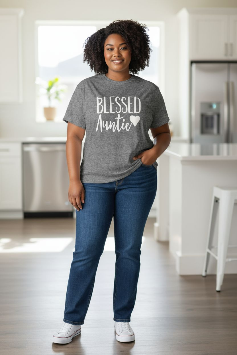 Show off your pride in being an aunt with this sweet and stylish "Blessed Auntie" graphic tee. Featuring bold lettering and a heart accent, this shirt is the perfect way to celebrate the joy and love of being an aunt.