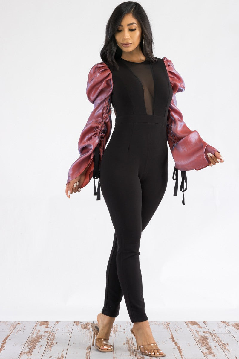 🌸Ruched Long-Sleeve Bodycon Jumpsuit Plunging V-Neck Tie-Sleeve Ankle🌻