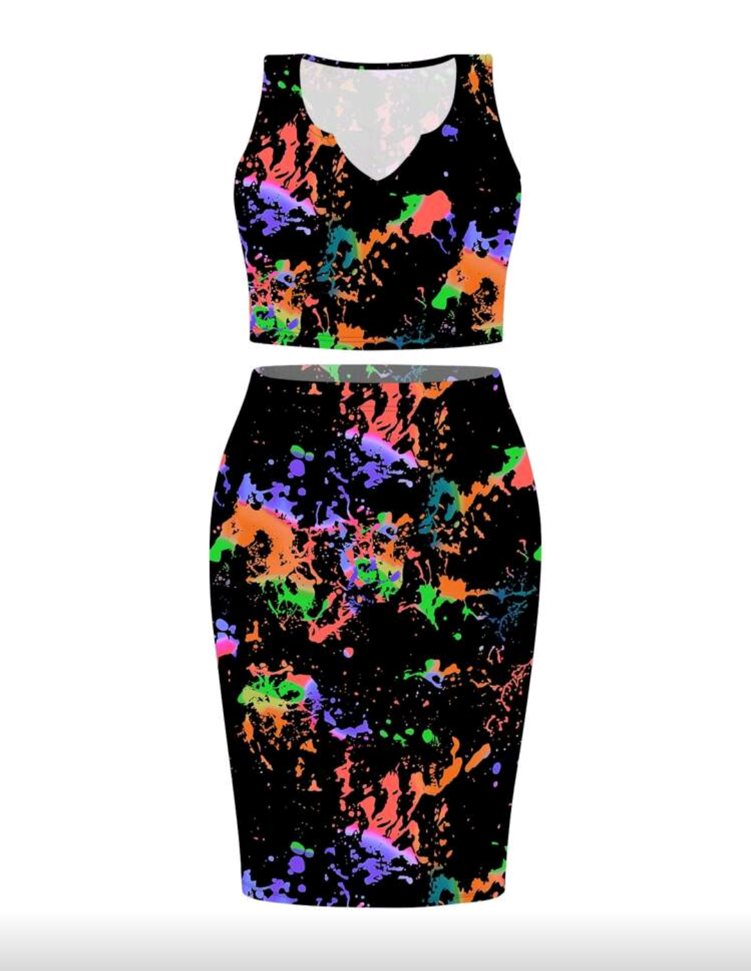 Featuring a curve-hugging pencil skirt and a v-neck crop top, this set flaunts your shape while serving vibrant, artsy energy 🎨💃🏽. The electric paint-splash pattern against the black background gives off major glow-in-the-dark vibes — perfect for girls’ night, festivals, or any place where you want to shine bright! ✨