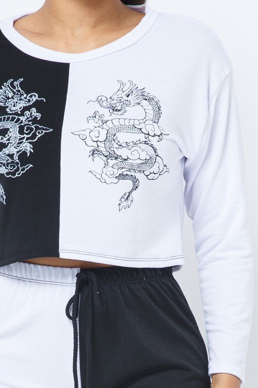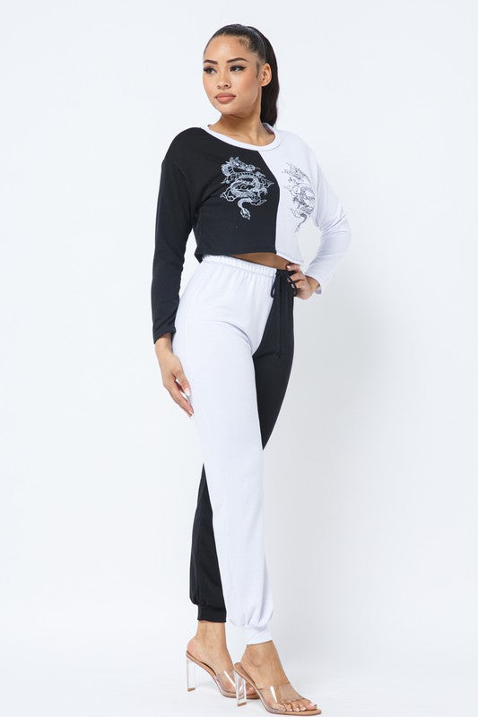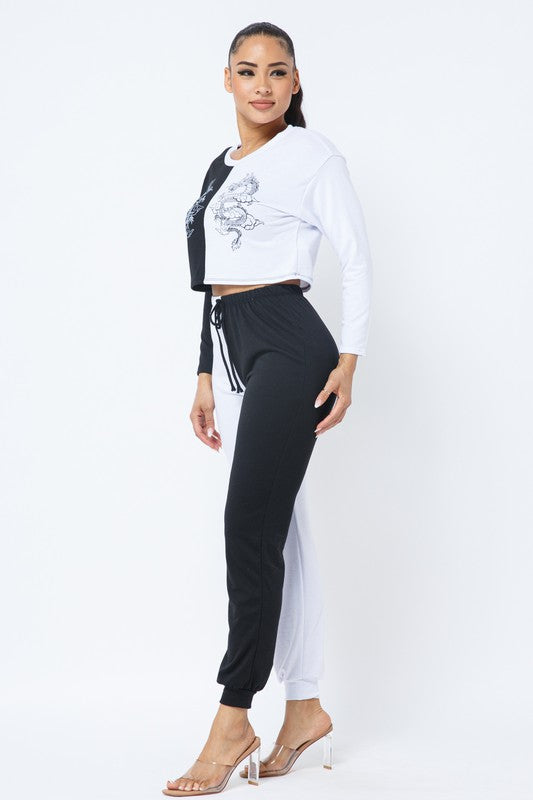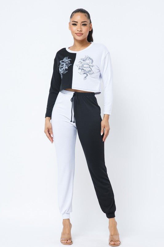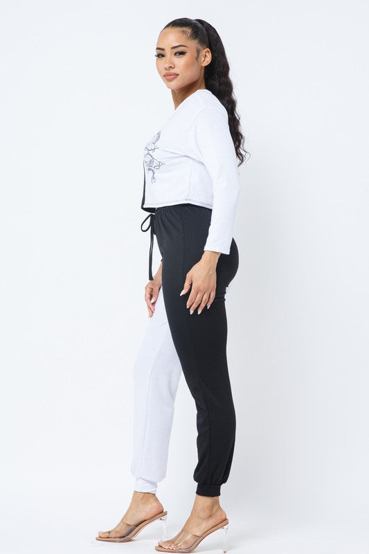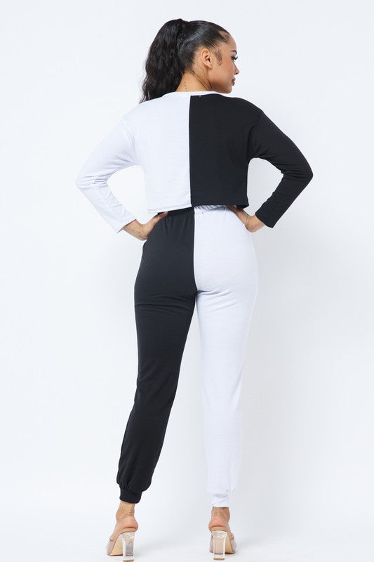 Charming color block two-piece set pairs a cropped sweatshirt with high-waist joggers for a bold, balanced look.Β