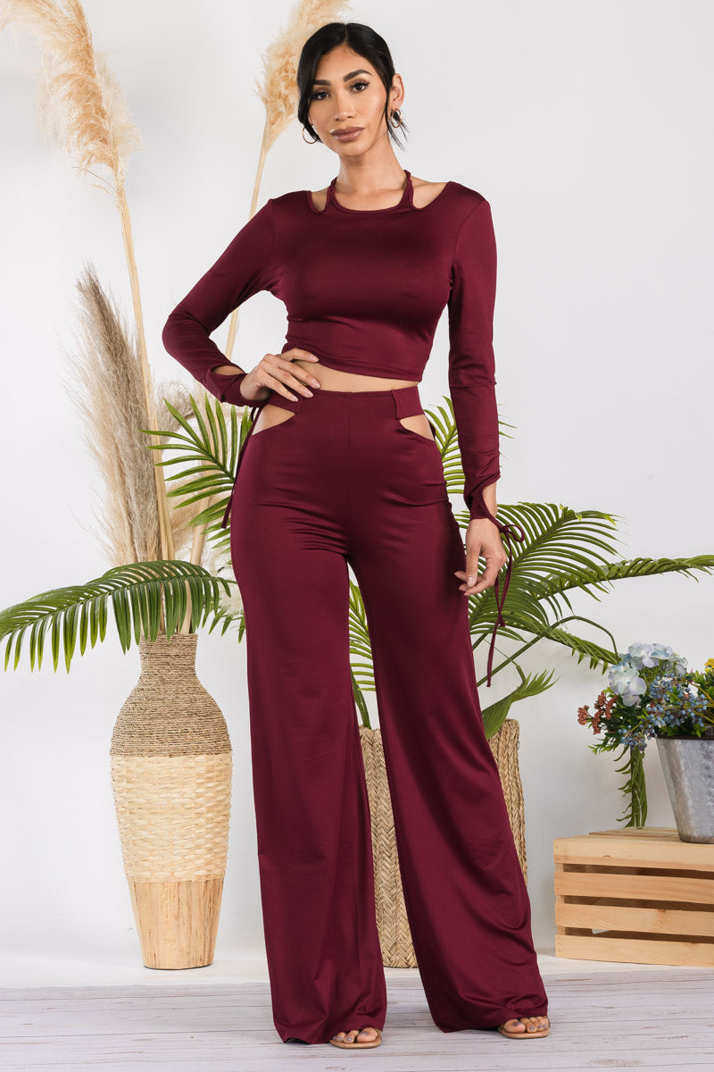This 2-piece cut-out crop top and high-waist wide-leg pant set blends flirty side and cuff cut-outs with a scoop neck, tie-neck detail, and stretchy polyester-spandex for a sleek, body-skimming fit.✨